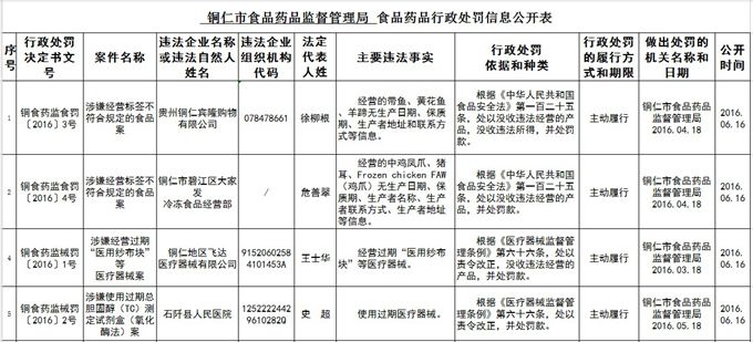 松桃苗族自治县2016年3-6月份食品药品行政处罚信息公开表