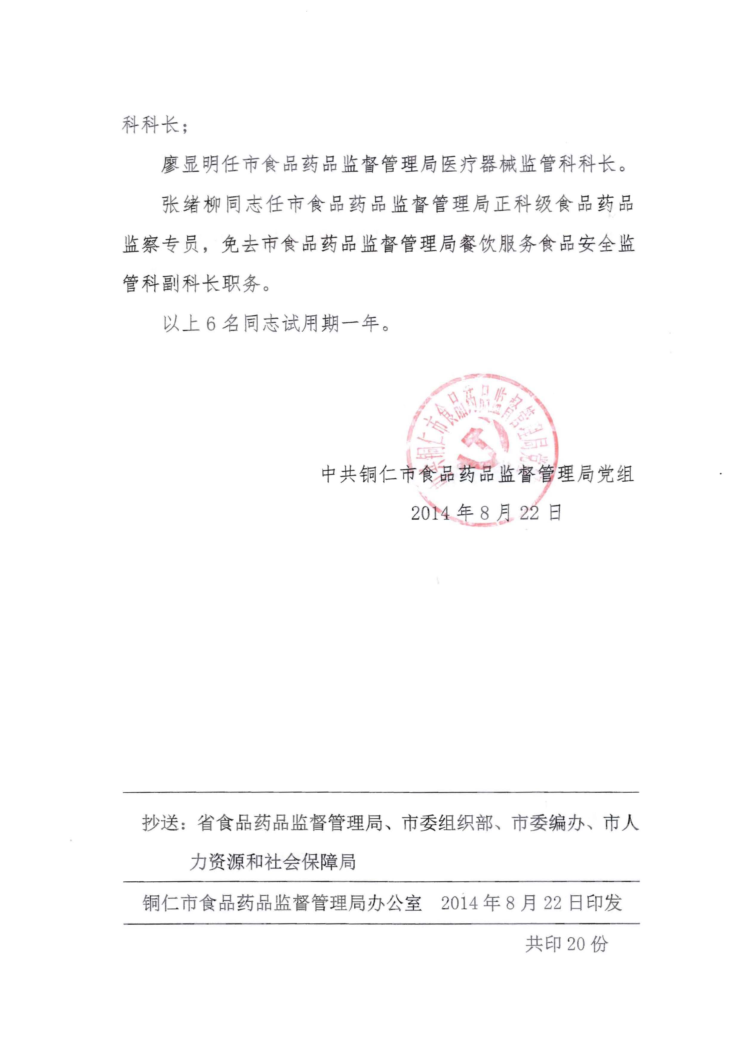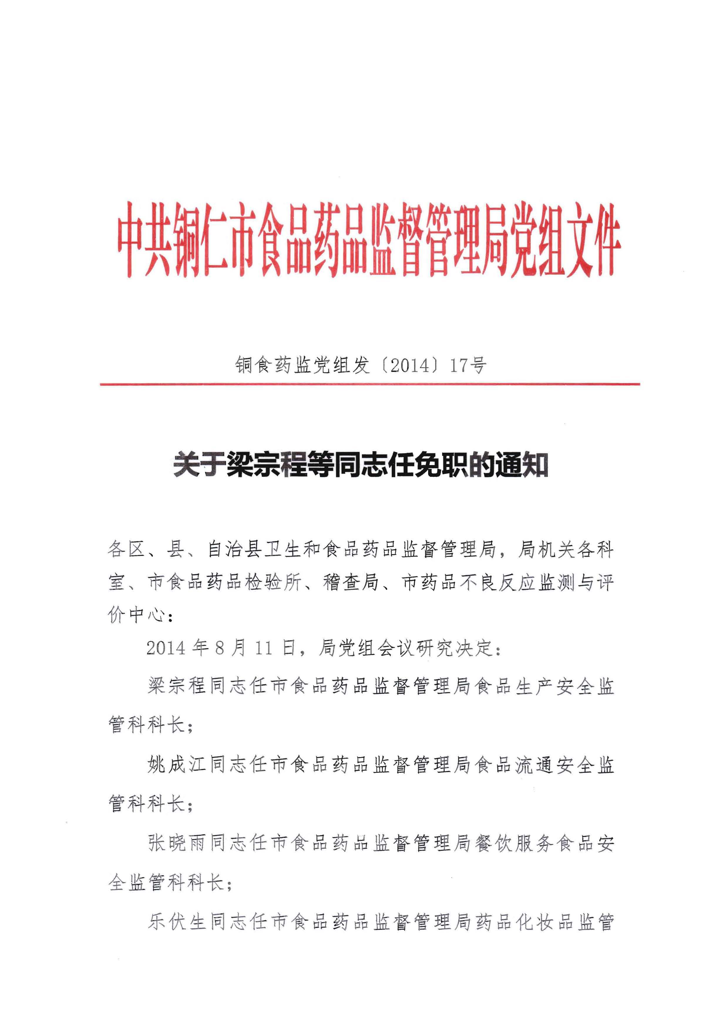 关于免去梁宗程同志现职的通知(铜食药监党组发〔2017〕6号)