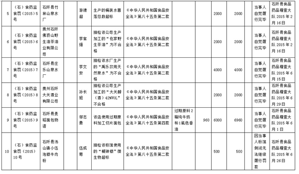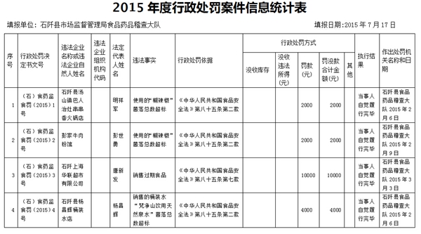 石阡市场监督局 2015年度行政处罚案件信息(7月17日)