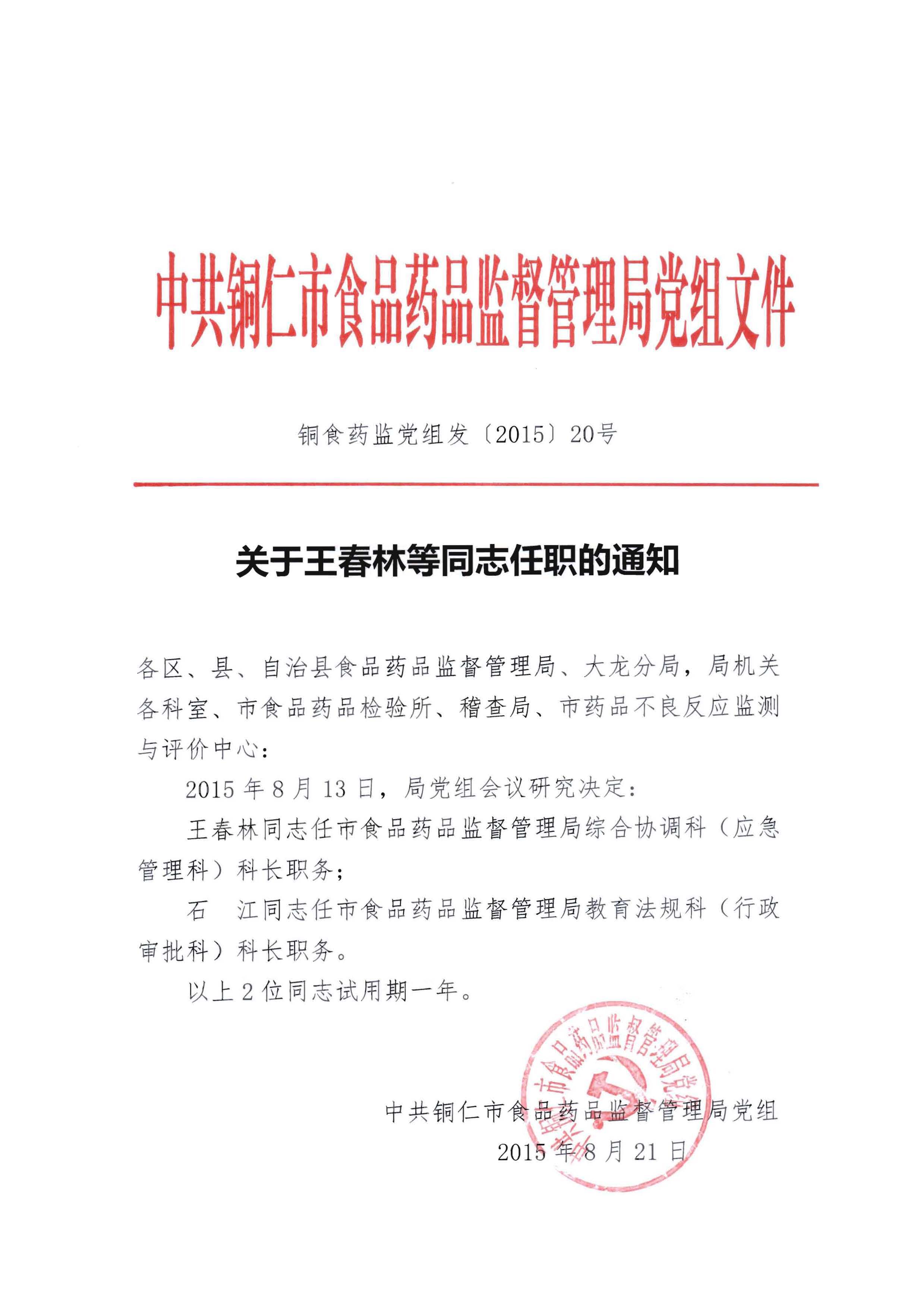 关于王春林等同志任免职的通知(铜食药监党组发〔2017〕...