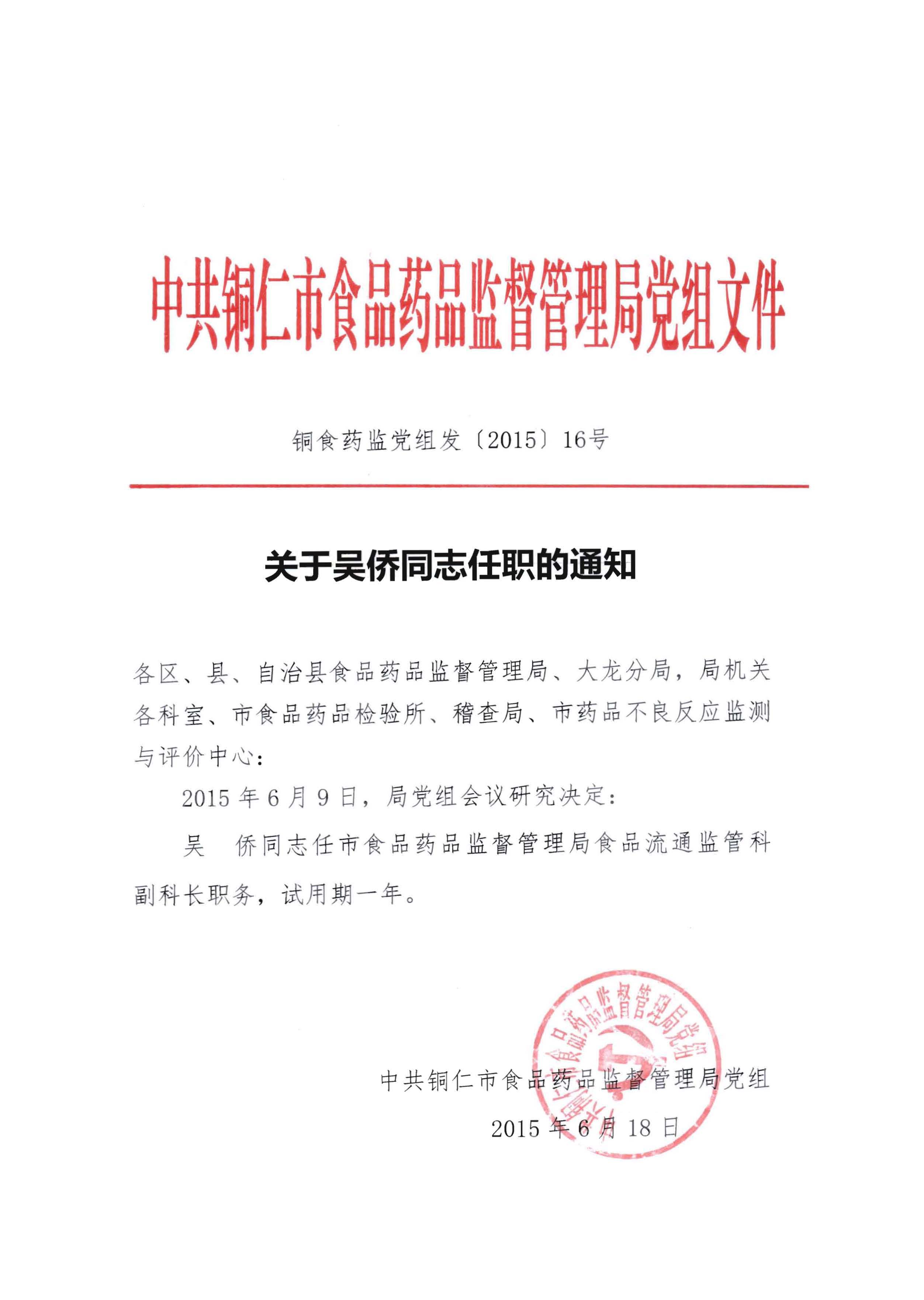 关于徐杰同志任职的通知(铜食药监党组发〔2017〕8号)