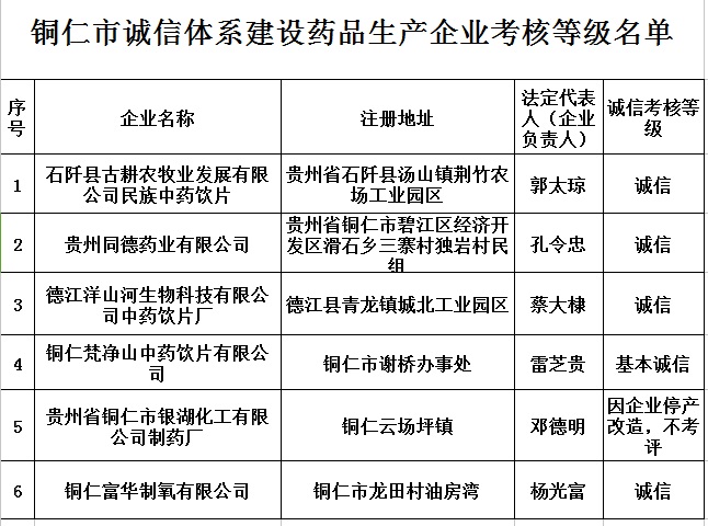 根据贵州省人民政府《贵州省企业信用征集和使用管理办法》(贵州省人民政府第136号令)和省食品药品监督管理局工作要求,我局制定了《铜仁市药品生产和经营企业诚信体系建设工作方案》,明确任务、目标和工作职责。在全市开展药品生产、经营企业诚信体系建立工作。现将我市2015年度药品生产企业、药品批发企业、药品零售连锁公司诚信体系考核结果通报如下;