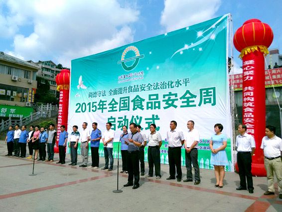 2015年6月16日上午,由市人民政府、碧江区人民政府、万山区政府主办,市食药监局、碧江区食药监局、万山区食药监局承办的“2015年铜仁市食品安全宣传周启动仪式”在碧江区锦江广场隆重举行。参加宣传周启动仪式的领导有:市委常委、市政府副市长张矛,市食安委副主任、市食品药品监督管理局局长王大洪,市科协主席李忠国以及市委宣传部、市监察院、市法院、市公安局等市食安委成员单位的相关领导。