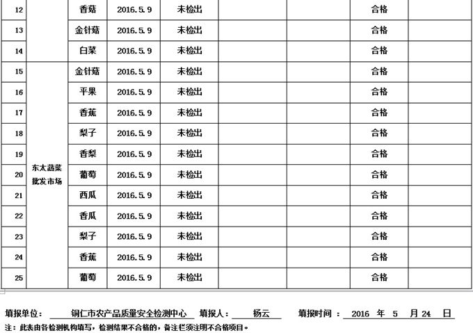 根据2016年食品监督抽检计划安排,我局委托铜仁市农产品质量安全检测中心于2016年5月9日对铜仁市东太蔬菜批发市场的食用农产品(蔬菜)进行了监督抽检,共抽检25个批次,合格25批次,现将抽检结果公告如下。