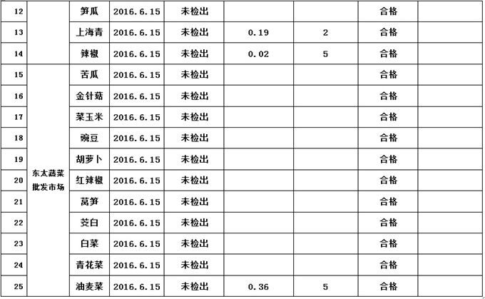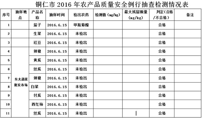 根据2016年食品监督抽检计划安排,我局委托铜仁市农产品质量安全检测中心于2016年6月15日对铜仁市东太蔬菜批发市场的食用农产品(蔬菜)进行了监督抽检,共抽检25个批次,合格25批次,现将抽检结果公告如下。