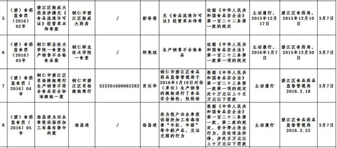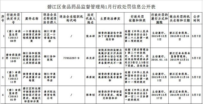 碧江区食品药品监督管理局1月行政处罚信息公开表