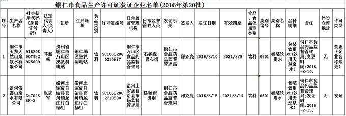 附件:铜仁市食品生产许可证获证企业名单(2016年第20批)