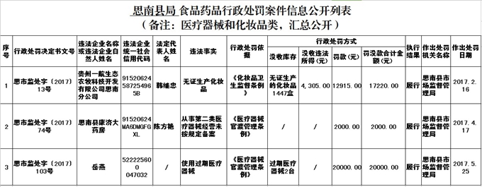 思南县局 食品药品行政处罚案件信息公开列表 (备注:医疗器械和化妆品类,汇总公开)