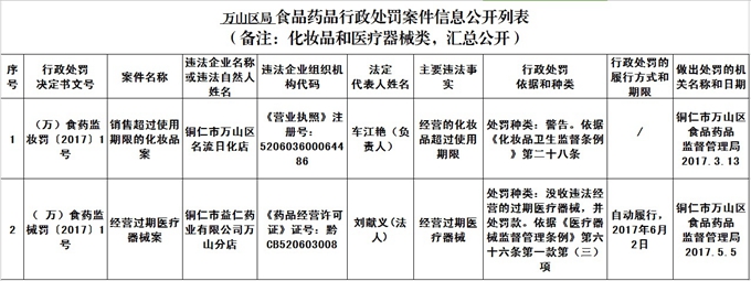 万山区局 食品药品行政处罚案件信息公开列表 (备注:化妆品和医疗器械类,汇总公开