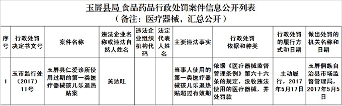 玉屏县局 食品药品行政处罚案件信息公开列表 (备注:医疗器械,汇总公开)