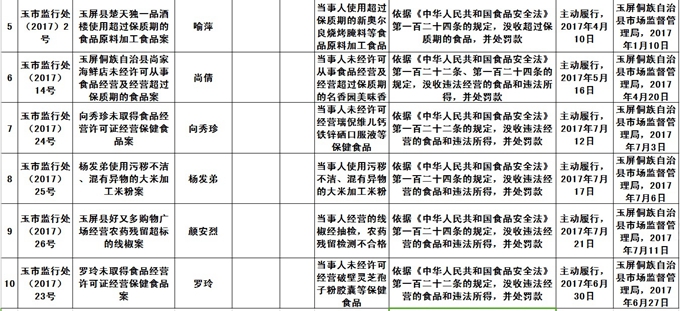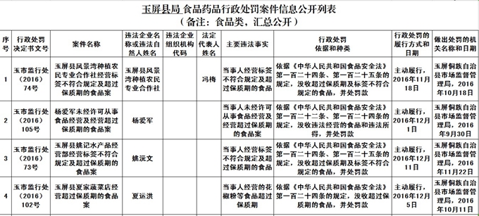 玉屏县局 食品药品行政处罚案件信息公开列表 (备注:食品类,汇总公开)