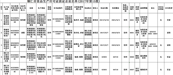 附件:铜仁市食品生产许可证获证企业名单(2017年第15批)