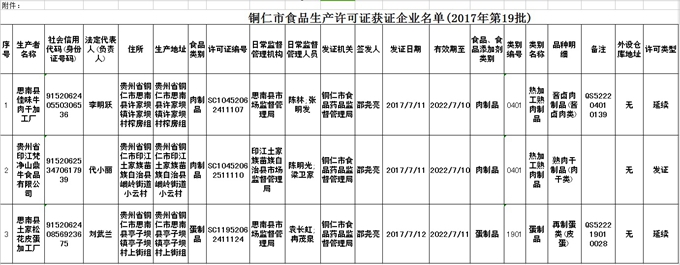 附件:铜仁市食品生产许可证获证企业名单(2017年第19批)