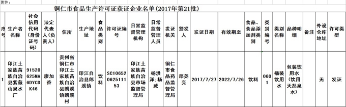 附件:铜仁市食品生产许可证获证企业名单(2017年第21批)