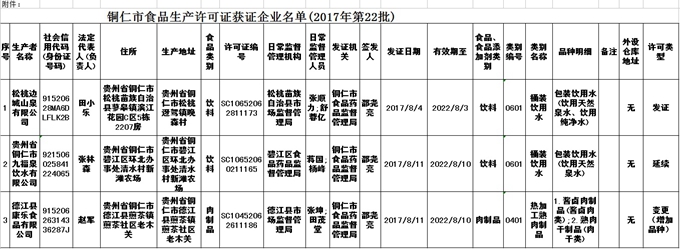 附件:铜仁市食品生产许可证获证企业名单(2017年第22批)