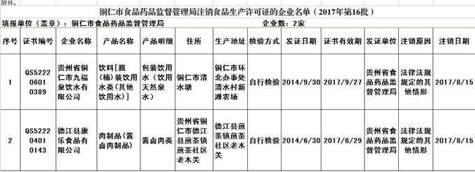 根据《中华人民共和国行政许可法》和《中华人民共和国食品安全法》、《食品生产许可管理办法》有关规定,鉴于企业申请延续换证。证号由原“QS”变为“SC”,决定将以下2家企业QS予以注销(名单见附件)。