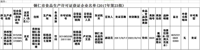 附件:铜仁市食品生产许可证获证企业名单(2017年第23批)