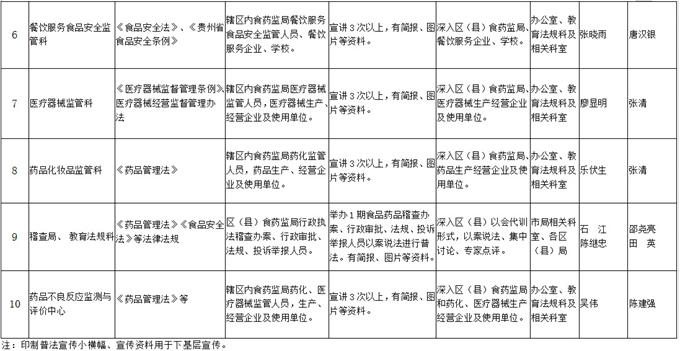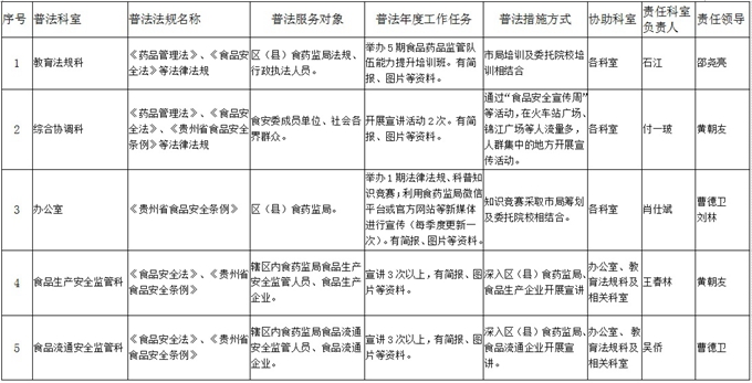 根据铜仁市法治宣传教育工作领导小组办公室《关于上报“谁执法谁普法”责任制年度工作任务清单的通知》,全面贯彻落实中央深改组第三十二次会议审议通过的《关于实行国家机关“谁执法谁普法”普法责任制的意见》和市委法治办2015年下发的《关于进一步建立完善“谁执法谁普法”工作责任制的实施意见》(铜市法治办字〔2015〕6号),为强化我局各科室普法工作责任,严格落实“谁执法谁普法”工作责任制,现将市局制定的2017年度市食品药品监管局“谁执法谁普法”责任分解清单印发各科室,请严格执行落实。
