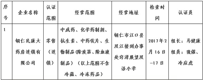 根据《中华人民共和国药品管理法》及其《中华人民共和国药品管理法实施条例》规定,经我局组织认证检查,以下1家企业符合《药品经营质量管理规范》(卫生部90号令)和《药品经营质量管理规范现场检查指导原则》规定的内容,现予以公示,公示时间2017年2月28日至2017年3月6日止,请社会各界予以监督。监督电话: