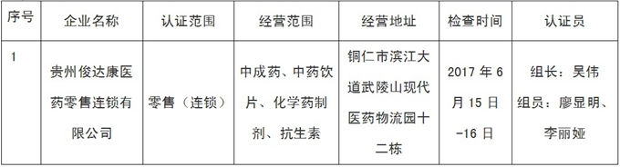 根据《中华人民共和国药品管理法》及其《中华人民共和国药品管理法实施条例》规定,经我局组织认证检查,以下1家企业符合《药品经营质量管理规范》(卫生部90号令)和《药品经营质量管理规范现场检查指导原则》规定的内容,现予以公示,公示时间2017年7月4日至2017年7月10日止,请社会各界予以监督。监督电话: